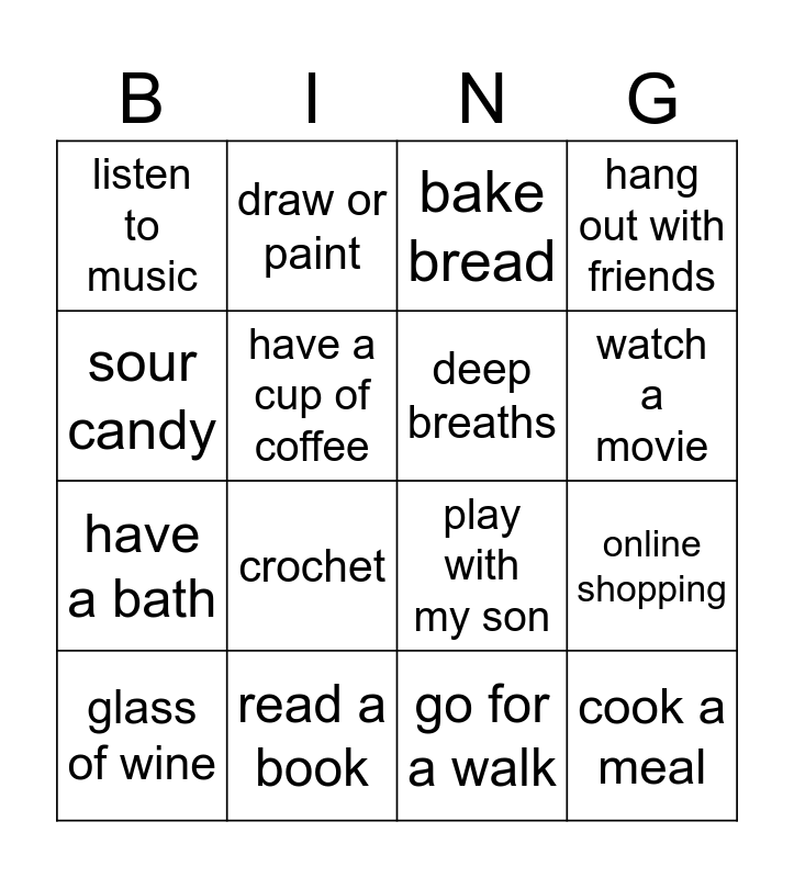 This bingo card has 16 words: read a book, online shopping, bake bread, listen to music, have a bath, draw or paint, play with my son, go for a walk, sour candy, have a cup of coffee, glass of wine, hang out with friends, crochet, watch a movie, deep breaths and cook a meal.