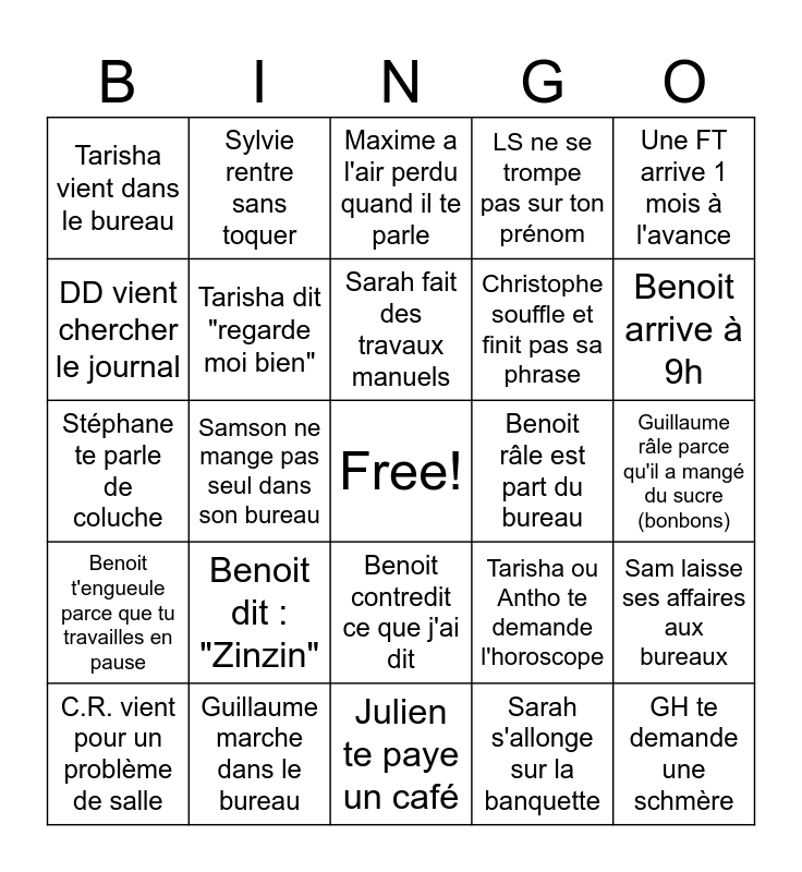 This bingo card has a free space and 24 words: Benoit dit : "Zinzin", Guillaume marche dans le bureau, Sarah fait des travaux manuels, C.R. vient pour un problème de salle, Une FT arrive 1 mois à l'avance, Tarisha vient dans le bureau, DD vient chercher le journal, Sylvie rentre sans toquer, Benoit râle est part du bureau, Benoit contredit ce que j'ai dit, Christophe souffle et finit pas sa phrase, Stéphane te parle de coluche, Tarisha ou Antho te demande l'horoscope, Sam laisse ses affaires aux bureaux, Tarisha dit "regarde moi bien", Sarah s'allonge sur la banquette, Guillaume râle parce qu'il a mangé du sucre (bonbons), Maxime a l'air perdu quand il te parle, Benoit arrive à 9h, Samson ne mange pas seul dans son bureau, GH te demande une schmère, Benoit t'engueule parce que tu travailles en pause, LS ne se trompe pas sur ton prénom and Julien te paye un café.