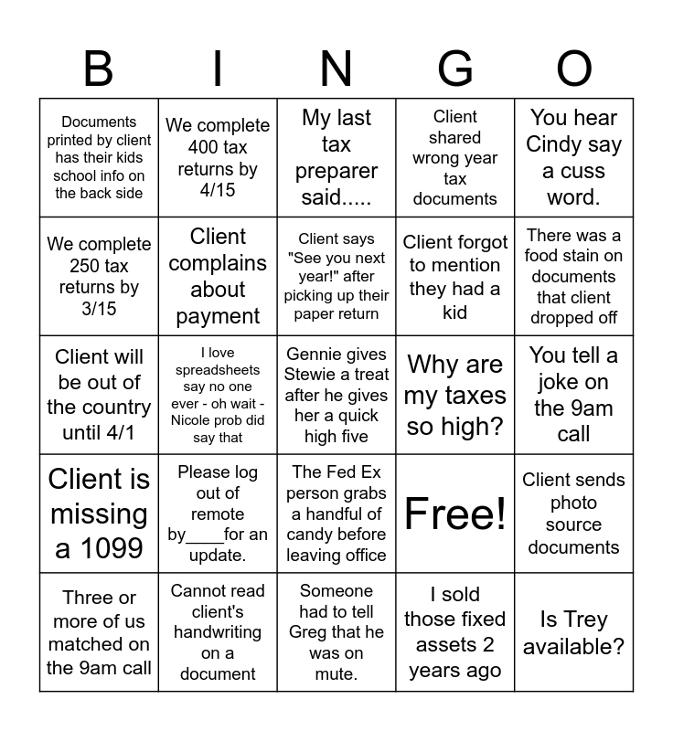 This bingo card has 25 words: Please log out of remote by____for an update., Someone had to tell Greg that he was on mute., Client says "See you next year!" after picking up their paper return, Three or more of us matched on the 9am call, You hear Cindy say a cuss word., Documents printed by client has their kids school info on the back side, We complete 250 tax returns by 3/15, We complete 400 tax returns by 4/15, Why are my taxes so high?, The Fed Ex person grabs a handful of candy before leaving office, Client forgot to mention they had a kid, Client will be out of the country until 4/1, Free!, Client sends photo source documents, Client complains about payment, Is Trey available?, You tell a joke on the 9am call, My last tax preparer said....., There was a food stain on documents that client dropped off, I love spreadsheets say no one ever - oh wait - Nicole prob did say that, Gennie gives Stewie a treat after he gives her a quick high five, Cannot read client's handwriting on a document, Client is missing a 1099, Client shared wrong year tax documents and I sold those fixed assets 2 years ago.