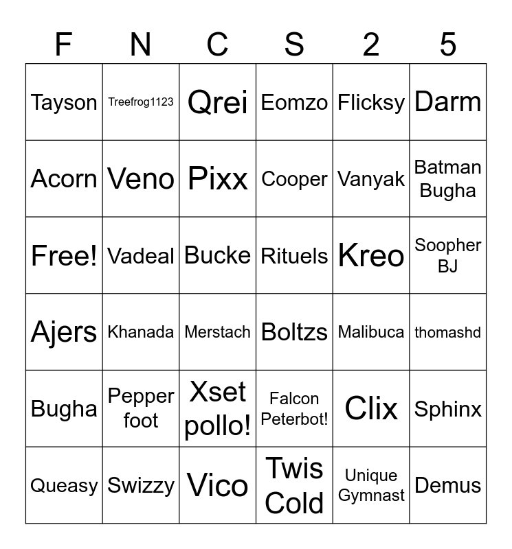 This bingo card has 36 words: Falcon Peterbot!, Xset pollo!, Twis Cold, Acorn, Ajers, Rituels, Veno, Vico, Flicksy, Clix, Batman Bugha, Eomzo, Sphinx, Vadeal, Cooper, Tayson, Bugha, Kreo, Free!, Qrei, Bucke, Khanada, Boltzs, Merstach, Malibuca, Treefrog1123, Vanyak, Swizzy, Pixx, Darm, Demus, Queasy, thomashd, Soopher BJ, Pepper foot and Unique Gymnast.