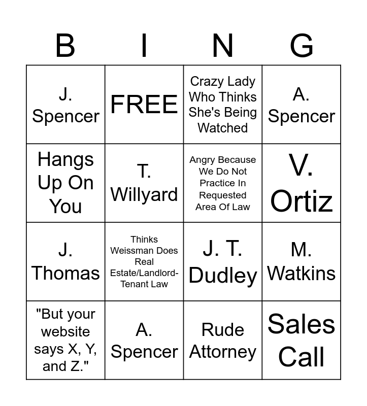 This bingo card has 19 words: J. T. Dudley, D. Lewis, Crazy Lady Who Thinks She's Being Watched, Sales Call, M. Watkins, Hangs Up On You, Rude Attorney, J. Spencer, FREE, J. Thomas, Thinks Weissman Does Real Estate/Landlord-Tenant Law, T. Willyard, Angry Because We Do Not Practice In Requested Area Of Law, A. Spencer, "But your website says X, Y, and Z.", No Answer, A. Spencer, V. Ortiz and T. Willyard.