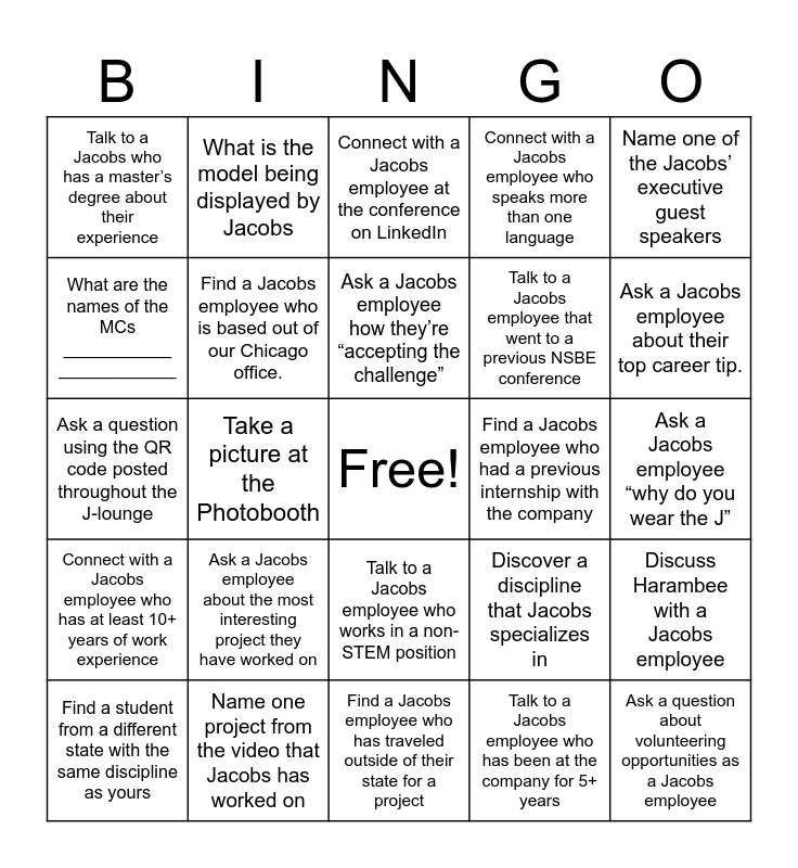 This bingo card has a free space and 26 words: Talk to a Jacobs employee who works in a non-STEM position, Talk to a Jacobs employee who has been at the company for 5+ years, Ask a Jacobs employee how they’re “accepting the challenge”, Name one project from the video that Jacobs has worked on, Name one of the Jacobs’ executive guest speakers, Talk to a Jacobs who has a master’s degree about their experience, What are the names of the MCs ___________ ____________, What is the model being displayed by Jacobs, Ask a Jacobs employee “why do you wear the J”, Discover a discipline that Jacobs specializes in, Talk to a Jacobs employee that went to a previous NSBE conference, Ask a question using the QR code posted throughout the J-lounge, Discuss Harambee with a Jacobs employee, Find a student from a different state with the same discipline as yours, Take a picture at the Photobooth, Complete mobile sign-in, Connect with a Jacobs employee who speaks more than one language, Connect with a Jacobs employee who has at least 10+ years of work experience, Connect with a Jacobs employee at the conference on LinkedIn, Ask a question about volunteering opportunities as a Jacobs employee, Ask a Jacobs employee about their top career tip., Find a Jacobs employee who has traveled outside of their state for a project, Find a Jacobs employee who had a previous internship with the company, Ask a Jacobs employee about the most interesting project they have worked on, Find a Jacobs employee who is based out of our Chicago office. and Speak to a Jacobs employee you met earlier in the conference..