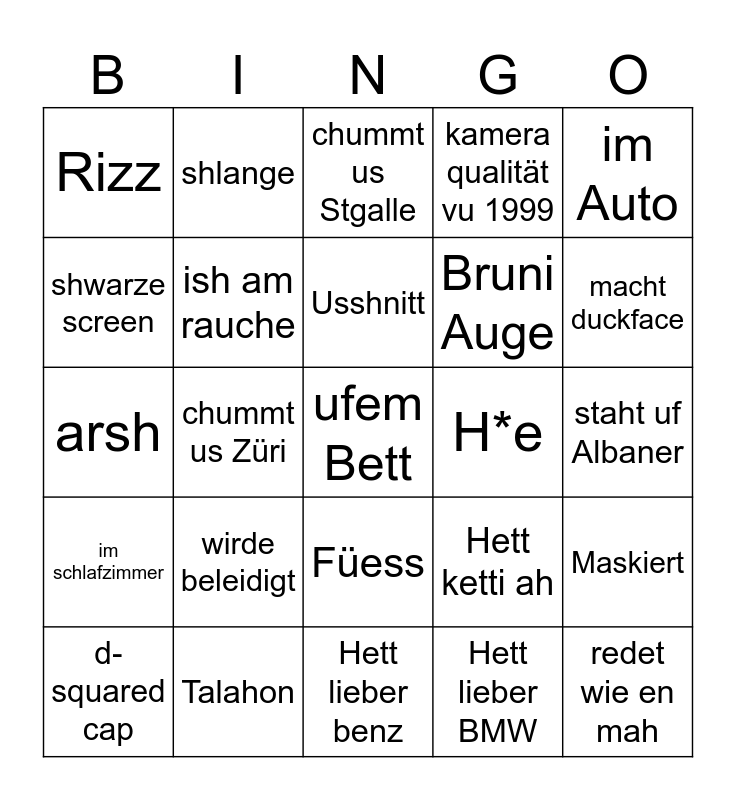 This bingo card has a free space and 24 words: wirde beleidigt, Talahon, Usshnitt, d-squared cap, im Auto, Rizz, shwarze screen, shlange, H*e, Füess, Bruni Auge, arsh, Hett ketti ah, Maskiert, ish am rauche, Hett lieber BMW, staht uf Albaner, chummt us Stgalle, macht duckface, chummt us Züri, redet wie en mah, im schlafzimmer, kamera qualität vu 1999 and Hett lieber benz.