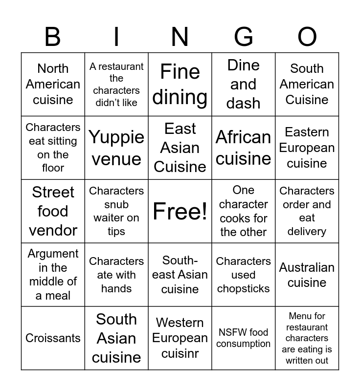 This bingo card has a free space and 24 words: Characters ate with hands, South Asian cuisine, East Asian Cuisine, Croissants, South American Cuisine, North American cuisine, Characters eat sitting on the floor, A restaurant the characters didn’t like, One character cooks for the other, South-east Asian cuisine, African cuisine, Street food vendor, Characters used chopsticks, Australian cuisine, Yuppie venue, NSFW food consumption, Characters order and eat delivery, Fine dining, Eastern European cuisine, Characters snub waiter on tips, Menu for restaurant characters are eating is written out, Argument in the middle of a meal, Dine and dash and Western European cuisinr.