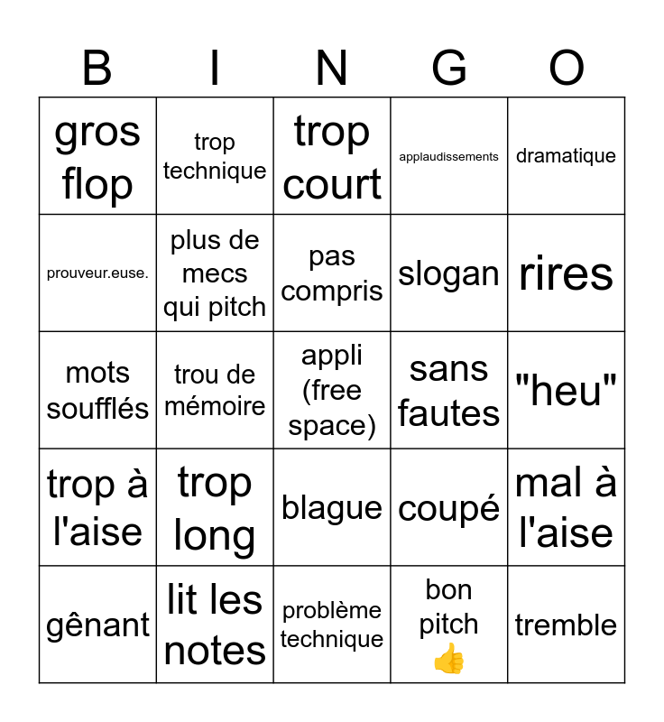 This bingo card has a free space and 24 words: trop long, lit les notes, pas compris, gênant, dramatique, gros flop, prouveur.euse., trop technique, sans fautes, blague, slogan, mots soufflés, coupé, mal à l'aise, plus de mecs qui pitch, bon pitch 👍, "heu", trop court, rires, trou de mémoire, tremble, trop à l'aise, applaudissements and problème technique.