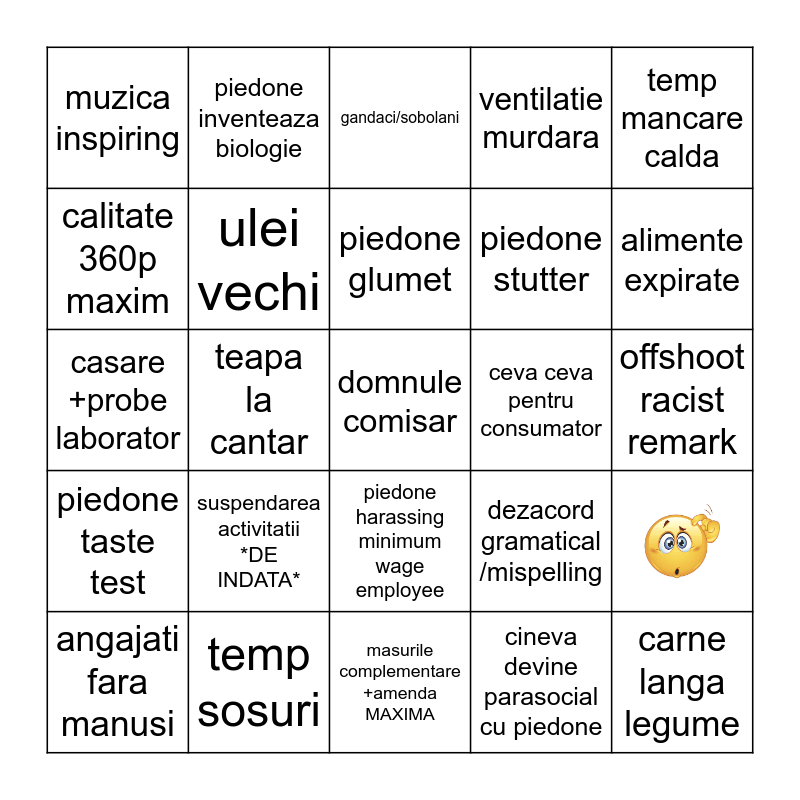This bingo card has 1 images, a free space and 23 words: suspendarea activitatii *DE INDATA*, temp sosuri, piedone glumet, angajati fara manusi, temp mancare calda, muzica inspiring, calitate 360p maxim, piedone inventeaza biologie, ceva ceva pentru consumator, piedone harassing minimum wage employee, piedone stutter, casare +probe laborator, dezacord gramatical /mispelling, ulei vechi, cineva devine parasocial cu piedone, offshoot racist remark, gandaci/sobolani, alimente expirate, teapa la cantar, carne langa legume, piedone taste test, ventilatie murdara and masurile complementare +amenda MAXIMA.