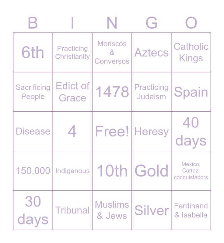 This bingo card has a free space and 24 words: Indigenous, Tribunal, 1478, 30 days, Catholic Kings, 6th, Sacrificing People, Practicing Christianity, Heresy, 10th, Practicing Judaism, Disease, Gold, Mexico, Cortez, conquistadors, Edict of Grace, Silver, 40 days, Moriscos & Conversos, Spain, 4, Ferdinand & Isabella, 150,000, Aztecs and Muslims & Jews.