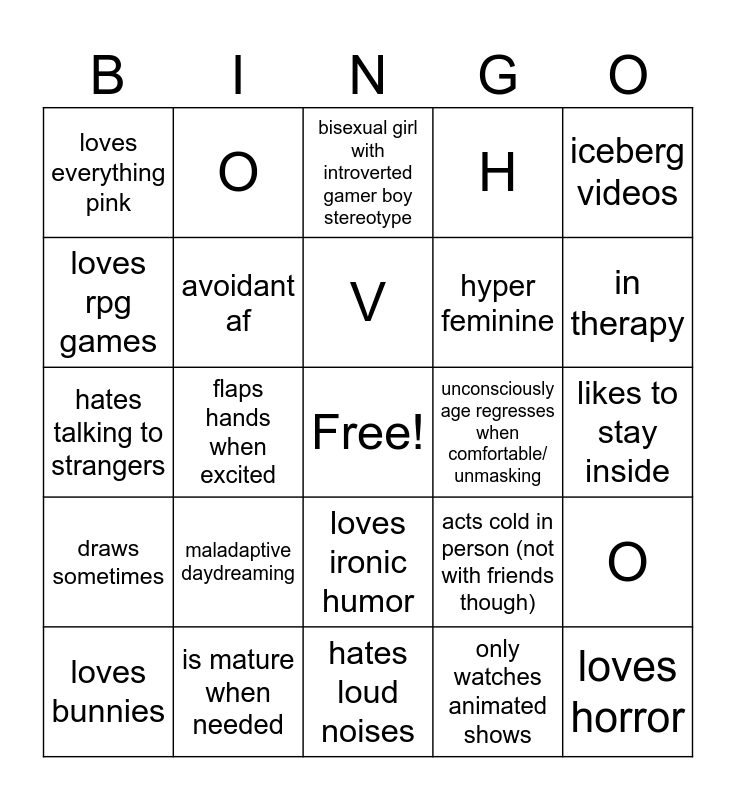 This bingo card has a free space and 29 words: loves bunnies, always gets the same thing everytime when at a restaurant, flaps hands when excited, hello kitty, loves everything pink, bisexual girl with introverted gamer boy stereotype, avoidant af, maladaptive daydreaming, unconsciously age regresses when comfortable/ unmasking, is mature when needed, likes to stay inside, loves horror, hates loud noises, only watches animated shows, in therapy, trust issues, loves ironic humor, draws sometimes, iceberg videos, hates talking to strangers, acts cold in person (not with friends though), hates social interaction and tries to avoid at all costs, hyper feminine, loves rpg games, H, O, O, V and A.