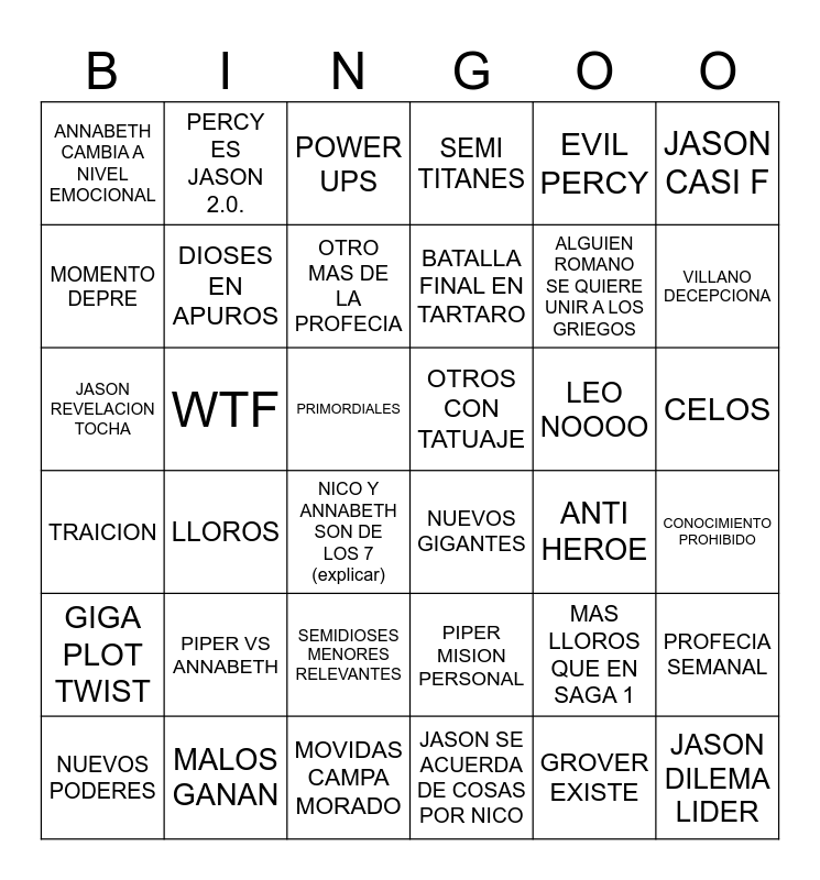 This bingo card has 36 words: PIPER MISION PERSONAL, SEMIDIOSES MENORES RELEVANTES, JASON SE ACUERDA DE COSAS POR NICO, MOMENTO DEPRE, TRAICION, OTROS CON TATUAJE, DIOSES EN APUROS, MOVIDAS CAMPA MORADO, EVIL PERCY, MAS LLOROS QUE EN SAGA 1, VILLANO DECEPCIONA, SEMI TITANES, PROFECIA SEMANAL, WTF, BATALLA FINAL EN TARTARO, ANNABETH CAMBIA A NIVEL EMOCIONAL, GIGA PLOT TWIST, LEO NOOOO, JASON REVELACION TOCHA, POWER UPS, PRIMORDIALES, LLOROS, NUEVOS GIGANTES, NICO Y ANNABETH SON DE LOS 7 (explicar), ANTI HEROE, PERCY ES JASON 2.0., ALGUIEN ROMANO SE QUIERE UNIR A LOS GRIEGOS, MALOS GANAN, OTRO MAS DE LA PROFECIA, JASON CASI F, JASON DILEMA LIDER, NUEVOS PODERES, CONOCIMIENTO PROHIBIDO, CELOS, PIPER VS ANNABETH and GROVER EXISTE.