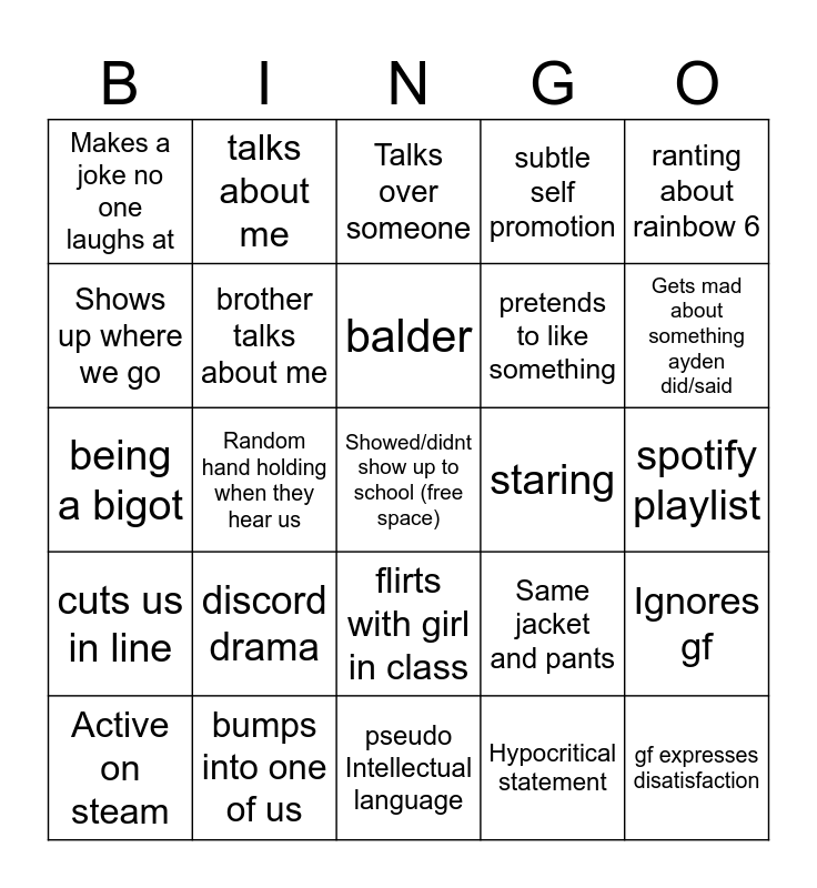 This bingo card has a free space and 24 words: discord drama, bumps into one of us, balder, Active on steam, ranting about rainbow 6, Makes a joke no one laughs at, Shows up where we go, talks about me, staring, flirts with girl in class, pretends to like something, being a bigot, Same jacket and pants, Ignores gf, brother talks about me, Hypocritical statement, spotify playlist, Talks over someone, Gets mad about something ayden did/said, Random hand holding when they hear us, gf expresses disatisfaction, cuts us in line, subtle self promotion and pseudo Intellectual language.
