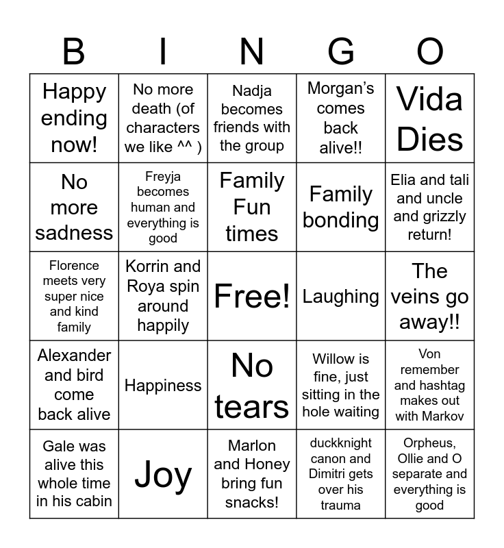 This bingo card has a free space and 24 words: Happiness, Joy, Family Fun times, Gale was alive this whole time in his cabin, Vida Dies, Happy ending now!, No more sadness, No more death (of characters we like ^^ ), Laughing, No tears, Family bonding, Florence meets very super nice and kind family, Willow is fine, just sitting in the hole waiting, Von remember and hashtag makes out with Markov, Freyja becomes human and everything is good, duckknight canon and Dimitri gets over his trauma, The veins go away!!, Nadja becomes friends with the group, Elia and tali and uncle and grizzly return!, Korrin and Roya spin around happily, Orpheus, Ollie and O separate and everything is good, Alexander and bird come back alive, Morgan’s comes back alive!! and Marlon and Honey bring fun snacks!.