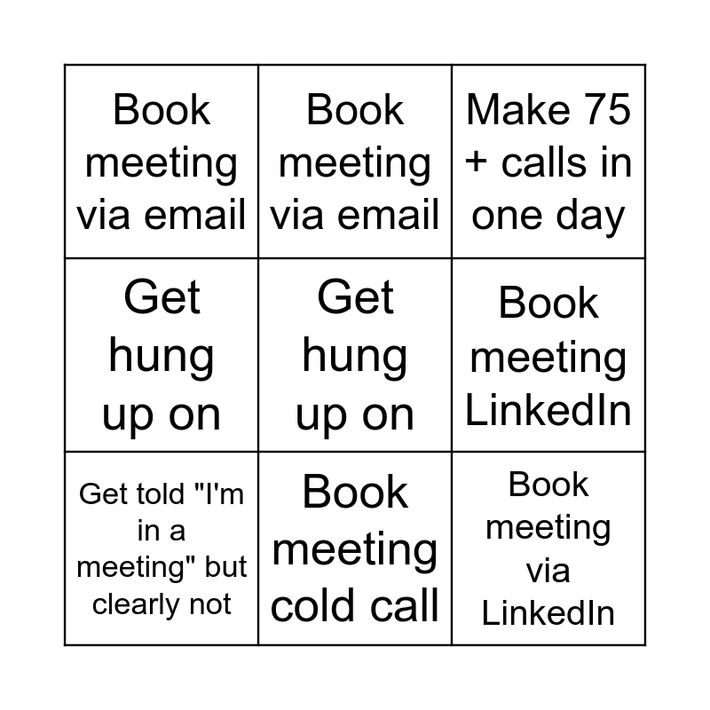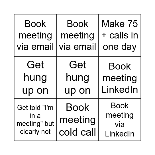 This bingo card has a free space and 10 words: Book meeting cold call, Make 75 + calls in one day, Book meeting via email, Book meeting via LinkedIn, Get hung up on, Get told "I'm in a meeting" but clearly not, Book meeting via email, Book meeting cold call, Book meeting LinkedIn and Book meeting email.