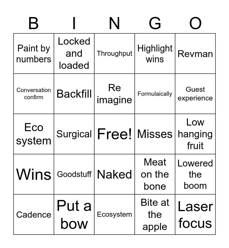 This bingo card has a free space and 25 words: Goodstuff, Ecosystem, Re imagine, Cadence, Revman, Paint by numbers, Conversation confirm, Locked and loaded, Misses, Naked, Formulaically, Eco system, Meat on the bone, Lowered the boom, Backfill, Prosecute, Low hanging fruit, Throughput, Guest experience, Surgical, Laser focus, Put a bow, Wins, Highlight wins and Bite at the apple.