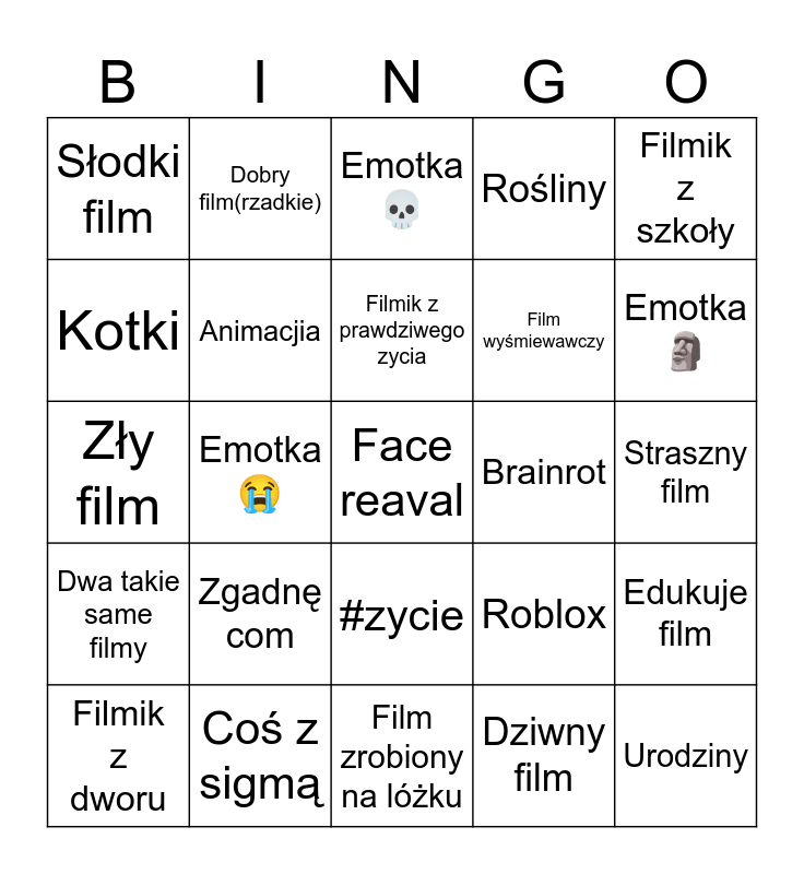 This bingo card has a free space and 24 words: Zgadnę com, Coś z sigmą, Filmik z prawdziwego zycia, Filmik z dworu, Filmik z szkoły, Słodki film, Kotki, Dobry film(rzadkie), Brainrot, #zycie, Film wyśmiewawczy, Zły film, Roblox, Edukuje film, Animacjia, Dziwny film, Straszny film, Emotka💀, Emotka🗿, Emotka😭, Urodziny, Dwa takie same filmy, Rośliny and Film zrobiony na lóżku.