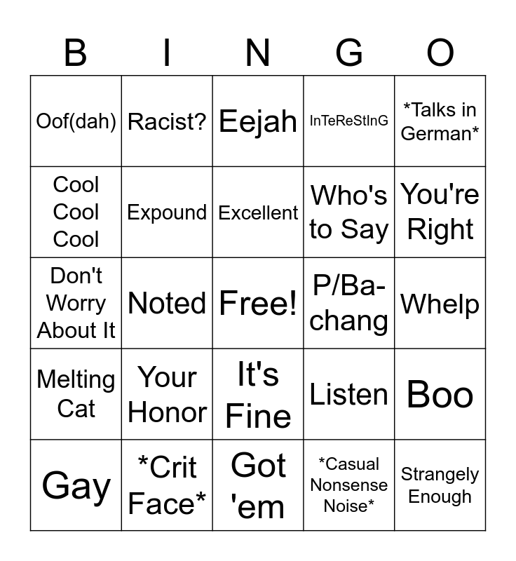 This bingo card has a free space and 29 words: Gay, Okokok, Noted, Rocks Fall Everyone Dies, Oof(dah), Eejah, Expound, Your Honor, P/Ba-chang, *Crit Face*, Whelp, Strangely Enough, Got 'em, *Casual Nonsense Noise*, You're Right, Wooooooow, It's Fine, Melting Cat, *Talks in German*, Don't Worry About It, Listen, Stop It (Get Some Help), Who's to Say, Cool Cool Cool, InTeReStInG, Racist?, Boo, Excellent and *Adresses Recording After the Opening*.