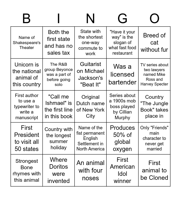 This bingo card has a free space and 24 words: Country with the longest summer holiday, Where Doritos were invented, Guitarist on Michael Jackson's "Beat It", Strongest Bone rhymes with this animal, Breed of cat without fur, Name of Shakespeare's Theater, Unicorn is the national animal of this country, Both the first state and has no sales tax, Series about a 1900s mob boss played by Cillian Murphy, Name of the fist permanent English Settlement in North America, Was a licensed bartender, First author to use a typewriter to write a manuscript, Produces 50% of global oxygen, Only "Friends" main character to never get married, The R&B group Beyonce was a part of before going solo, First American Idol winner, Country "The Jungle Book" takes place in, State with the shortest one-way commute to work, TV series about two lawyers named Mike Ross and Harvey Specter, "Call me Ishmael" is the first line in this book, First animal to be Cloned, First President to visit all 50 states, "Have it your way" is the slogan of what fast food restaurant and An animal with four noses.