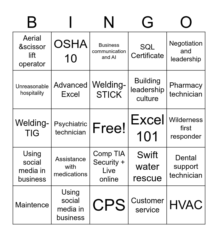 This bingo card has a free space and 44 words: Electrical, HVAC, Machine Operator, Maintence, Plumbing, Customer service, Business communication and AI, Essential skills for new managers, Negotiation and leadership, Using social media in business, SQL Certificate, Excel 101, Comp TIA Security + Live online, Assistance with medications, CNA, CPS, Medical Office management, Welding-TIG, Phlebotomy, Pharmacy technician, OSHA 10, National Wildfire Certification, Welding-MIG, Aerial &scissor lift operator, HAZWOPPER, Wilderness first responder, Chemical plant operations, Forklift operator, Swift water rescue, Using social media in business, Assistance with medications, Dental support technician, EMT basics, Certified medical assistant, Psychiatric technician, Fall protection trainer, Qualified rigger, ServSafe, Welding- STICK, Unreasonable hospitality, Building leadership culture, Storytelling in leadership, Advanced Excel and Keyboarding.