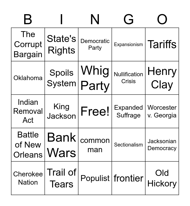 This bingo card has a free space and 24 words: Bank Wars, Trail of Tears, Whig Party, Cherokee Nation, Tariffs, The Corrupt Bargain, Oklahoma, State's Rights, Expanded Suffrage, common man, Nullification Crisis, Indian Removal Act, Sectionalism, Jacksonian Democracy, Spoils System, frontier, Worcester v. Georgia, Democratic Party, Henry Clay, King Jackson, Old Hickory, Battle of New Orleans, Expansionism and Populist.