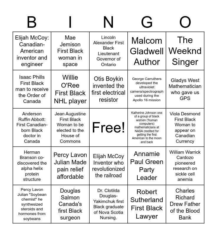 This bingo card has a free space and 29 words: Percy Lavon Julian "Soybean chemist" he synthesized steroids and hormones from soybeans, Alice Ball Chemist who developed an injectable treatment for leprosy, Jean Augustine First Black Woman to be elected to the House of Commons, Mary Ann Shadd Cary The first woman to become a publisher in Canada., Elijah McCoy: Canadian- American inventor and engineer, Lincoln Alexander First Black Lieutenant Governor of Ontario, Willie O'Ree First Black NHL player, Percy Lavon Julian Made pain relief affordable, Katherine Johnson one of a group of black women ('human computers) mathematicians at NASA credited for getting the first American to the moon and back, Douglas Salmon Canada's first Black surgeon, Viola Desmond First Black Woman to appear on Canadian Currency, Charles Richard Drew Father of the Blood Bank, Dr. Clotilda Douglas- Yakimchuk first Black graduate of Nova Scotia Nursing., Robert Sutherland First Black Lawyer, Gladys West Mathematician who gave us GPS, Guion Bluford was the first African American in space on the Challenger's eighth, Elijah McCoy Inventor who revolutionized the railroad, Herman Branson co-discovered the alpha helix protein structure, The Weeknd Singer, Anderson Ruffin Abbott: First Canadian- born Black doctor in Canada, Annamie Paul Green Party Leader, Mary Jackson NASA's first female African American engineer., George Carruthers developed the ultraviolet camera/spectrograph used during the Apollo 16 mission, Isaac Phills First Black man to receive the Order of Canada, Malcom Gladwell Author, Mae Jemison First Black woman in space, William Warrick Cardozo pioneered research on sickle cell anemia, Otis Boykin invented the first electrical resistor and Anne Clare Cools First Black Canadian to be named to the Senate.
