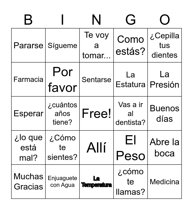 This bingo card has a free space and 24 words: ¿Cómo te sientes?, Enjuaguete con Agua, Sentarse, Muchas Gracias, ¿Cepilla tus dientes, Pararse, Farmacia, Sígueme, Vas a ir al dentista?, Allí, La Estatura, Esperar, El Peso, Abre la boca, Por favor, ¿cómo te llamas?, Buenos días, Te voy a tomar..., La Presión, ¿cuántos años tiene?, Medicina, ¿lo que está mal?, Como estás? and La Temperatura.