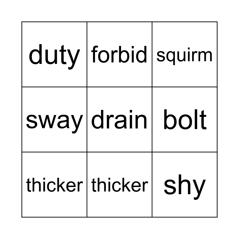 This bingo card has a free space and 8 words: bolt, squirm, forbid, thicker, duty, shy, sway and thicker.