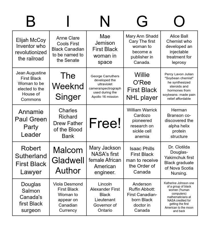 This bingo card has a free space and 27 words: Isaac Phills First Black man to receive the Order of Canada, Otis Boykin invented the first electrical resistor, Willie O'Ree First Black NHL player, Lincoln Alexander First Black Lieutenant Governor of Ontario, Jean Augustine First Black Woman to be elected to the House of Commons, Mae Jemison First Black woman in space, Anne Clare Cools First Black Canadian to be named to the Senate, Robert Sutherland First Black Lawyer, William Warrick Cardozo pioneered research on sickle cell anemia, Dr. Clotilda Douglas- Yakimchuk first Black graduate of Nova Scotia Nursing., Annamie Paul Green Party Leader, Mary Ann Shadd Cary The first woman to become a publisher in Canada., Douglas Salmon Canada's first Black surgeon, Viola Desmond First Black Woman to appear on Canadian Currency, Percy Lavon Julian "Soybean chemist" he synthesized steroids and hormones from soybeans- made pain relief affordable, Gladys West Mathematician who gave us GPS, The Weeknd Singer, George Carruthers developed the ultraviolet camera/spectrograph used during the Apollo 16 mission, Malcom Gladwell Author, Elijah McCoy Inventor who revolutionized the railroad, Herman Branson co- discovered the alpha helix protein structure, Anderson Ruffin Abbott: First Canadian- born Black doctor in Canada, Charles Richard Drew Father of the Blood Bank, Katherine Johnson one of a group of black women ('human computers) mathematicians at NASA credited for getting the first American to the moon and back, Mary Jackson NASA's first female African American engineer., Alice Ball Chemist who developed an injectable treatment for leprosy and Guion Bluford was the first African American in space on the Challenger's eighth.