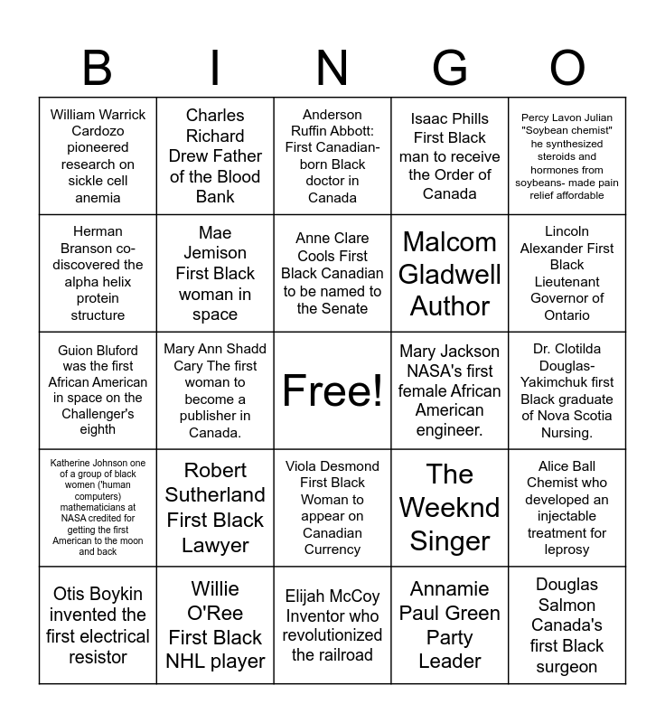 This bingo card has a free space and 27 words: The Weeknd Singer, George Carruthers developed the ultraviolet camera/spectrograph used during the Apollo 16 mission, Malcom Gladwell Author, Elijah McCoy Inventor who revolutionized the railroad, Herman Branson co- discovered the alpha helix protein structure, Anderson Ruffin Abbott: First Canadian- born Black doctor in Canada, Charles Richard Drew Father of the Blood Bank, Katherine Johnson one of a group of black women ('human computers) mathematicians at NASA credited for getting the first American to the moon and back, Mary Jackson NASA's first female African American engineer., Alice Ball Chemist who developed an injectable treatment for leprosy, Guion Bluford was the first African American in space on the Challenger's eighth, Isaac Phills First Black man to receive the Order of Canada, Otis Boykin invented the first electrical resistor, Willie O'Ree First Black NHL player, Lincoln Alexander First Black Lieutenant Governor of Ontario, Jean Augustine First Black Woman to be elected to the House of Commons, Mae Jemison First Black woman in space, Anne Clare Cools First Black Canadian to be named to the Senate, Robert Sutherland First Black Lawyer, William Warrick Cardozo pioneered research on sickle cell anemia, Dr. Clotilda Douglas- Yakimchuk first Black graduate of Nova Scotia Nursing., Annamie Paul Green Party Leader, Mary Ann Shadd Cary The first woman to become a publisher in Canada., Douglas Salmon Canada's first Black surgeon, Viola Desmond First Black Woman to appear on Canadian Currency, Percy Lavon Julian "Soybean chemist" he synthesized steroids and hormones from soybeans- made pain relief affordable and Gladys West Mathematician who gave us GPS.