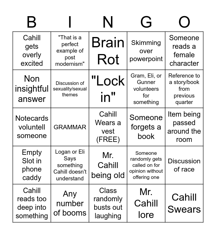 This bingo card has a free space and 24 words: Logan or Eli Says something Cahill doesn't understand, Any number of booms, "Lock in", Cahill reads too deep into something, Someone reads a female character, Cahill gets overly excited, Non insightful answer, "That is a perfect example of post modernism", Someone forgets a book, Mr. Cahill being old, Gram, Eli, or Gunner volunteers for something, Notecards voluntell someone, Someone randomly gets called on for opinion without offering one, Discussion of race, Discussion of sexuality/sexual themes, Mr. Cahill lore, Item being passed around the room, Brain Rot, Reference to a story/book from previous quarter, GRAMMAR, Cahill Swears, Empty Slot in phone caddy, Skimming over powerpoint and Class randomly busts out laughing.