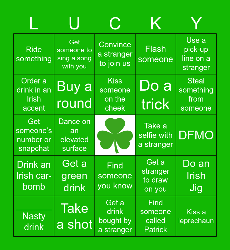 This bingo card has a free space and 24 words: Get a green drink, Take a shot, Kiss someone on the cheek, _______ Nasty drink, Use a pick-up line on a stranger, Ride something, Order a drink in an Irish accent, Get someone to sing a song with you, Take a selfie with a stranger, Find someone you know, Do a trick, Get someone’s number or snapchat, Get a stranger to draw on you, Do an Irish Jig, Buy a round, Find someone called Patrick, DFMO, Convince a stranger to join us, Steal something from someone, Dance on an elevated surface, Kiss a leprechaun, Drink an Irish car-bomb, Flash someone and Get a drink bought by a stranger.