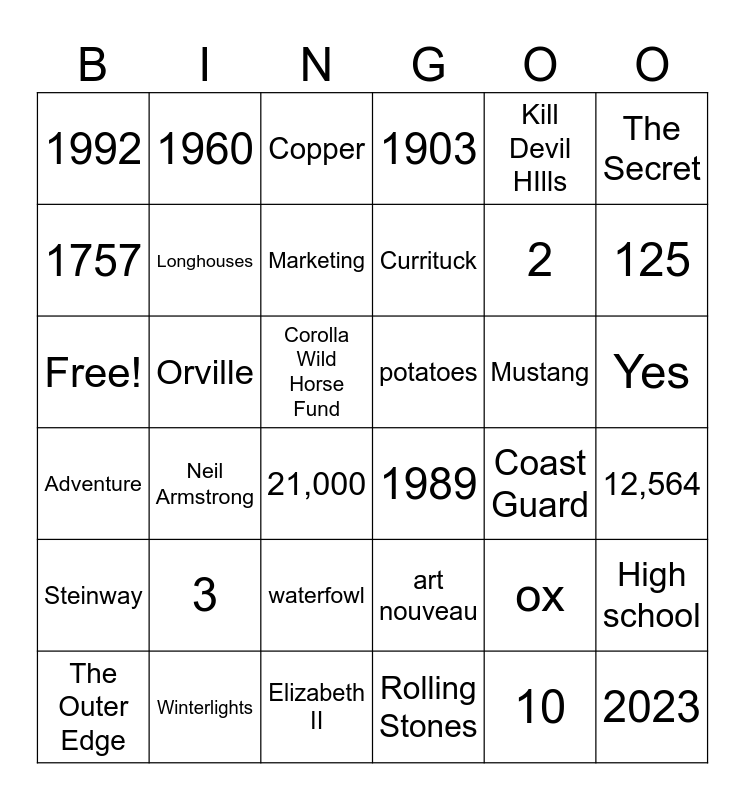 This bingo card has 36 words: art nouveau, waterfowl, Rolling Stones, 1757, Adventure, potatoes, Longhouses, Elizabeth II, Kill Devil HIlls, ox, 125, 1903, High school, Orville, Currituck, 1992, Steinway, Mustang, Free!, Copper, Corolla Wild Horse Fund, Neil Armstrong, 1989, 21,000, Coast Guard, 1960, 2, Winterlights, Marketing, The Secret, 2023, The Outer Edge, 12,564, Yes, 3 and 10.