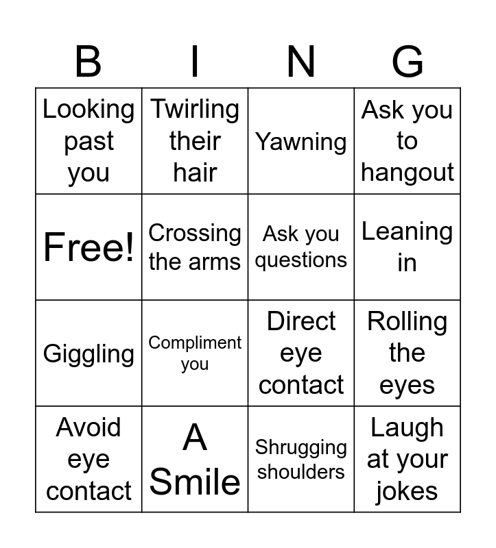 This bingo card has 16 words: A Smile, Rolling the eyes, Yawning, Looking past you, Giggling, Twirling their hair, Direct eye contact, Shrugging shoulders, Free!, Crossing the arms, Avoid eye contact, Ask you to hangout, Compliment you, Leaning in, Ask you questions and Laugh at your jokes.