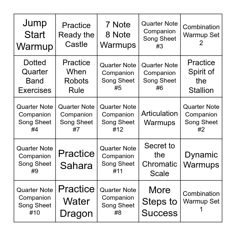 This bingo card has 25 words: Practice Sahara, Quarter Note Companion Song Sheet #8, Quarter Note Companion Song Sheet #5, Quarter Note Companion Song Sheet #10, Combination Warmup Set 2, Jump Start Warmup, Dotted Quarter Band Exercises, Practice Ready the Castle, Articulation Warmups, Quarter Note Companion Song Sheet #11, Quarter Note Companion Song Sheet #6, Quarter Note Companion Song Sheet #4, Secret to the Chromatic Scale, Dynamic Warmups, Practice When Robots Rule, Combination Warmup Set 1, Quarter Note Companion Song Sheet #2, 7 Note 8 Note Warmups, Practice Spirit of the Stallion, Quarter Note Companion Song Sheet #7, Quarter Note Companion Song Sheet #12, Practice Water Dragon, Quarter Note Companion Song Sheet #9, Quarter Note Companion Song Sheet #3 and More Steps to Success.