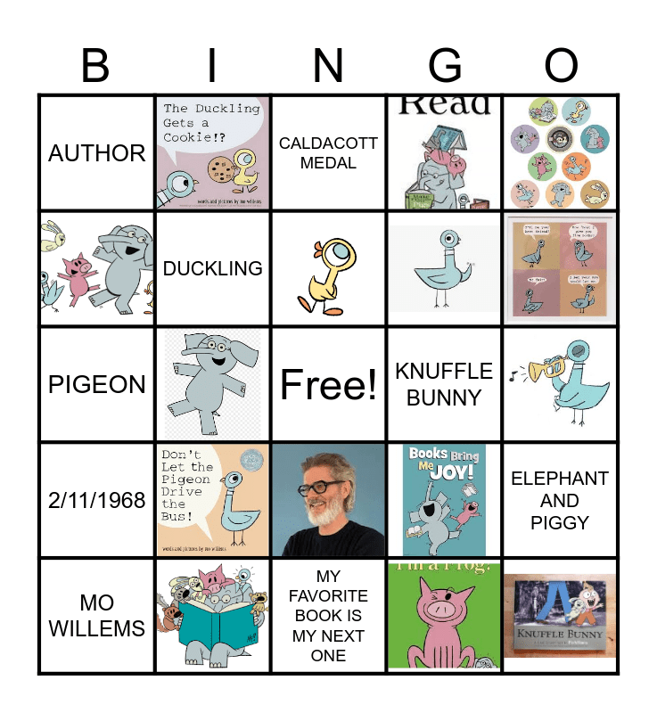 This bingo card has 15 images, a free space and 9 words: MO WILLEMS, AUTHOR, KNUFFLE BUNNY, PIGEON, ELEPHANT AND PIGGY, DUCKLING, CALDACOTT MEDAL, 2/11/1968 and MY FAVORITE BOOK IS MY NEXT ONE.