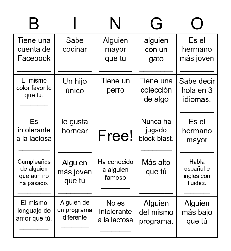 This bingo card has a free space and 24 words: Alguien más joven que tú ________, Alguien de un programa diferente ________, Tiene un perro ________, El mismo lenguaje de amor que tú. ________, Es el hermano más joven ________, Tiene una cuenta de Facebook ________, El mismo color favorito que tú. ________, Sabe cocinar ________, Nunca ha jugado block blast. ________, Ha conocido a alguien famoso ________, Tiene una colección de algo ________, Es intolerante a la lactosa ________, Más alto que tú ________, Habla español e inglés con fluidez. ________, Un hijo único ________, Alguien del mismo programa. ________, Es el hermano mayor ________, Alguien mayor que tu ________, Sabe decir hola en 3 idiomas. ________, le gusta hornear ________, Alguien más bajo que tú ________, Cumpleaños de alguien que aún no ha pasado. __________, alguien con un gato ________ and No es intolerante a la lactosa ________.