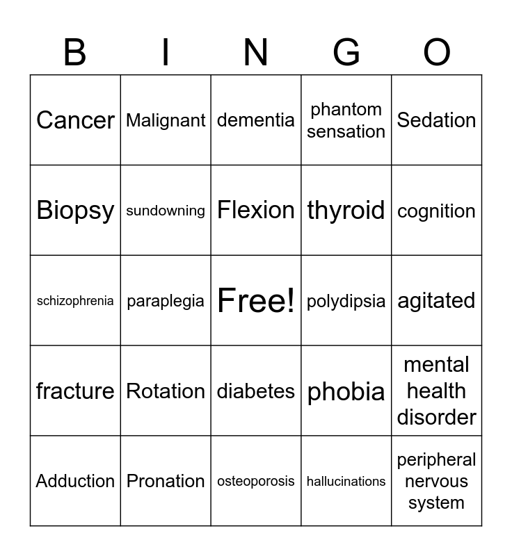 This bingo card has a free space and 24 words: Rotation, Pronation, Flexion, Adduction, Sedation, Cancer, Biopsy, Malignant, polydipsia, diabetes, thyroid, schizophrenia, phobia, mental health disorder, sundowning, hallucinations, agitated, dementia, cognition, paraplegia, peripheral nervous system, fracture, phantom sensation and osteoporosis.
