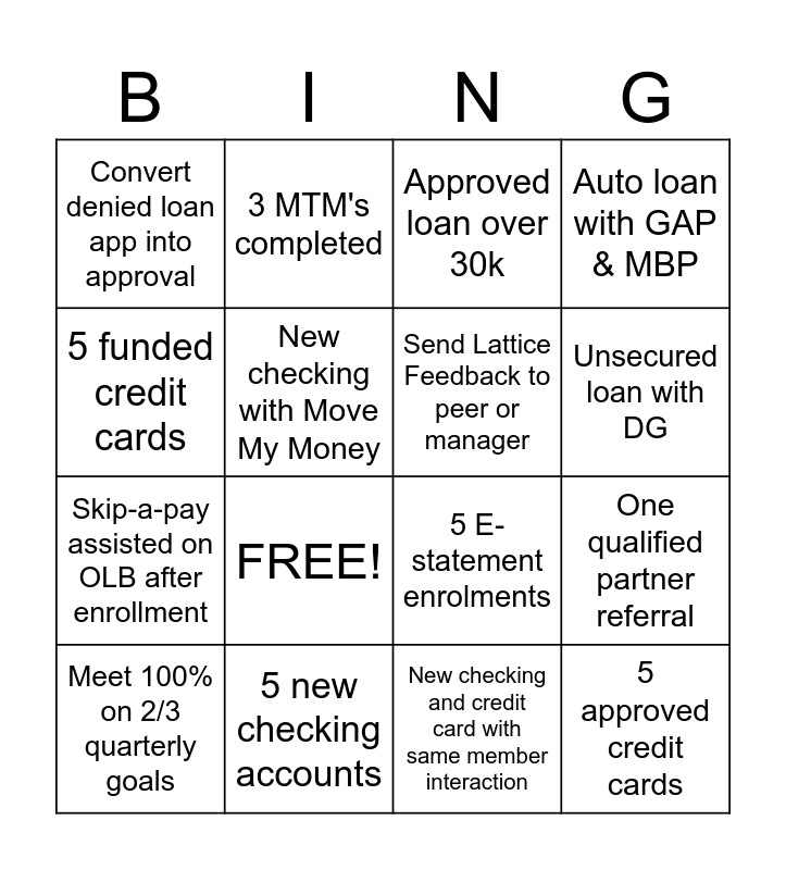 This bingo card has 16 words: 5 new checking accounts, One qualified partner referral, Approved loan over 30k, Convert denied loan app into approval, Skip-a-pay assisted on OLB after enrollment, 3 MTM's completed, 5 E-statement enrolments, New checking and credit card with same member interaction, 5 funded credit cards, New checking with Move My Money, Meet 100% on 2/3 quarterly goals, Auto loan with GAP & MBP, FREE!, Unsecured loan with DG, Send Lattice Feedback to peer or manager and 5 approved credit cards.