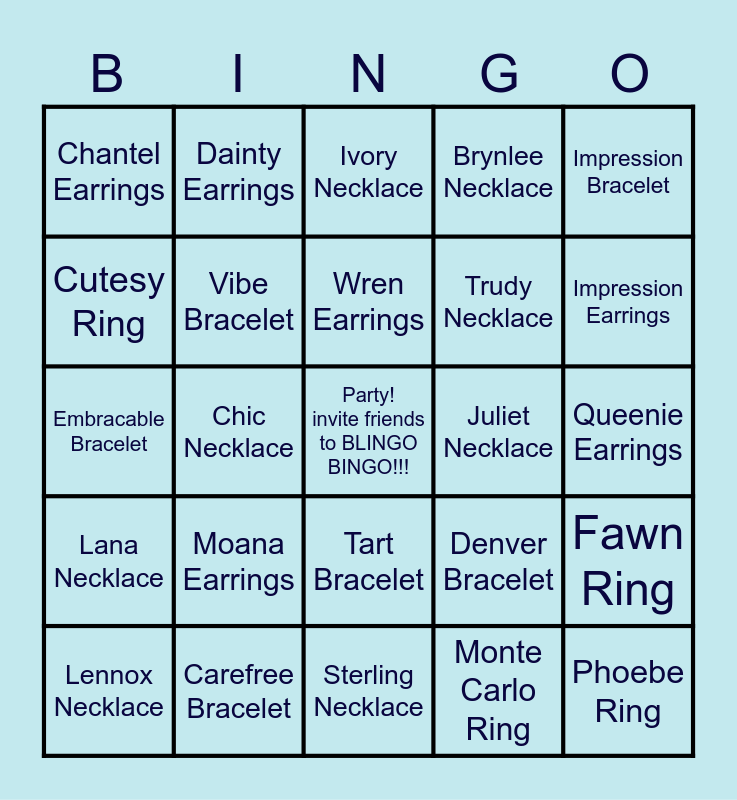This bingo card has a free space and 29 words: Lennox Necklace, Roo Earrings, Chic Necklace, Jewel Bracelet, Chantel Earrings, Ivory Necklace, Vibe Bracelet, Moana Earrings, Juliet Necklace, Carefree Bracelet, Queenie Earrings, Phoebe Ring, Sterling Necklace, Monte Carlo Ring, Impression Earrings, Glow Earrings, Tart Bracelet, Lana Necklace, Impression Bracelet, Embracable Bracelet, Denver Bracelet, Paradigm Rings, Trudy Necklace, Cutesy Ring, Brynlee Necklace, Dainty Earrings, Fawn Ring, Wren Earrings and Arcadia Bracelet.