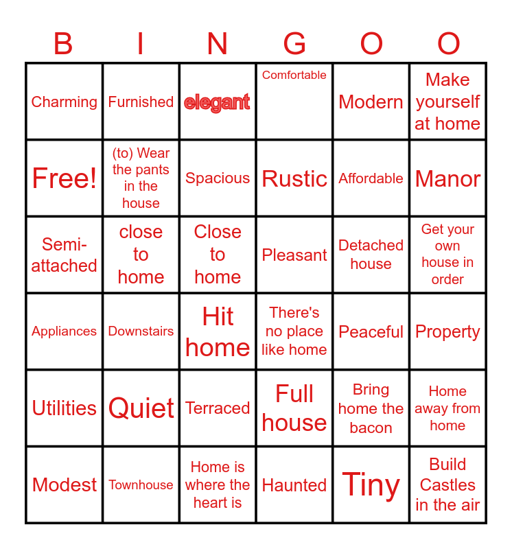 This bingo card has 36 words: Appliances, Downstairs, Home is where the heart is, Rustic, Detached house, Get your own house in order, Charming, Townhouse, elegant, Full house, Affordable, Make yourself at home, Utilities, close to home, Spacious, Comfortable, Bring home the bacon, Property, Free!, (to) Wear the pants in the house, Hit home, There's no place like home, Peaceful, Home away from home, Semi-attached, Furnished, Close to home, Haunted, Modern, Manor, Modest, Quiet, Terraced, Pleasant, Tiny and Build Castles in the air.