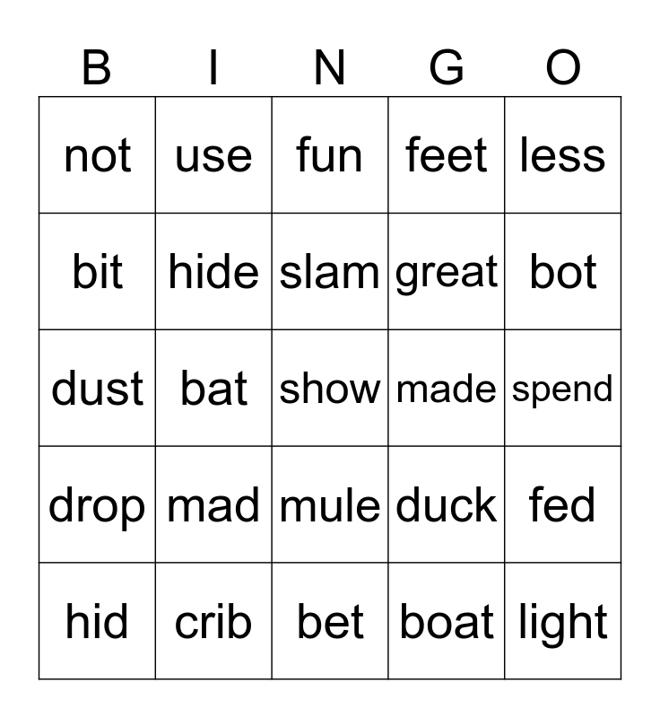 This bingo card has 25 words: mad, bet, slam, hid, less, not, bit, use, made, mule, great, dust, duck, fed, hide, light, spend, fun, bot, bat, show, crib, drop, feet and boat.