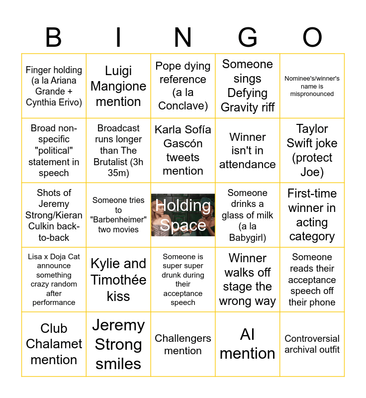 This bingo card has a free space and 25 words: Kylie and Timothée kiss, Challengers mention, Karla Sofía Gascón tweets mention, Club Chalamet mention, Nominee's/winner's name is mispronounced, Finger holding (a la Ariana Grande + Cynthia Erivo), Broad non-specific "political" statement in speech, Luigi Mangione mention, Someone drinks a glass of milk (a la Babygirl), Someone is super super drunk during their acceptance speech, Winner isn't in attendance, Shots of Jeremy Strong/Kieran Culkin back-to-back, Winner walks off stage the wrong way, Someone reads their acceptance speech off their phone, Broadcast runs longer than The Brutalist (3h 35m), Your Best Picture pick wins, First-time winner in acting category, Pope dying reference (a la Conclave), Taylor Swift joke (protect Joe), Someone tries to "Barbenheimer" two movies, Controversial archival outfit, Jeremy Strong smiles, Lisa x Doja Cat announce something crazy random after performance, Someone sings Defying Gravity riff and AI mention.