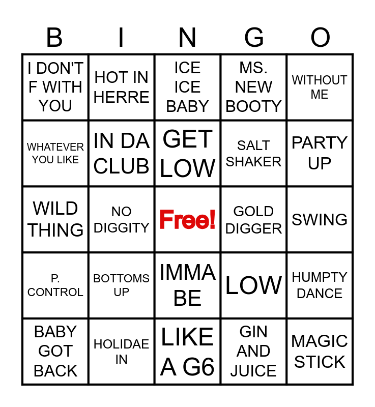 This bingo card has a free space and 32 words: GIN AND JUICE, PONY, NO DIGGITY, FREEK-A-LEEK, P. CONTROL, IN DA CLUB, WITHOUT ME, HUMPTY DANCE, HOT IN HERRE, YEAH!, GET LOW, ICE ICE BABY, INDEPENDENT, BACK THAT AZZ UP, GOLD DIGGER, SHAKE THAT, BABY GOT BACK, WILD THING, IMMA BE, BOTTOMS UP, LOW, TIPSY, SWING, HOLIDAE IN, MAGIC STICK, MS. NEW BOOTY, SALT SHAKER, WHATEVER YOU LIKE, I DON'T F WITH YOU, LIKE A G6, SMACK THAT and PARTY UP.