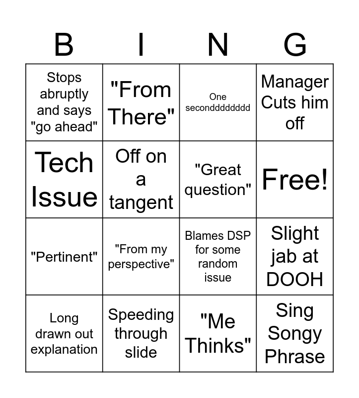 This bingo card has 18 words: "From my perspective", Sing Songy Phrase, One secondddddddd, Stops abruptly and says "go ahead", Blames DSP for some random issue, Manager Cuts him off, Long drawn out explanation, "From There", Free!, "Pertinent", "Me Thinks", Tech Issue, Slight jab at DOOH, Off on a tangent, "Great question", OOH Specific Joke, Speeding through slide and Beard.