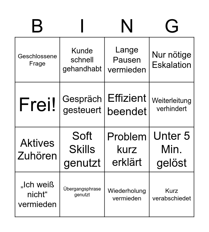 This bingo card has 16 words: Übergangsphrase genutzt, Unter 5 Min. gelöst, Lange Pausen vermieden, Geschlossene Frage, Aktives Zuhören, Kunde schnell gehandhabt, Problem kurz erklärt, Wiederholung vermieden, Frei!, Gespräch gesteuert, „Ich weiß nicht“ vermieden, Nur nötige Eskalation, Soft Skills genutzt, Weiterleitung verhindert, Effizient beendet and Kurz verabschiedet.