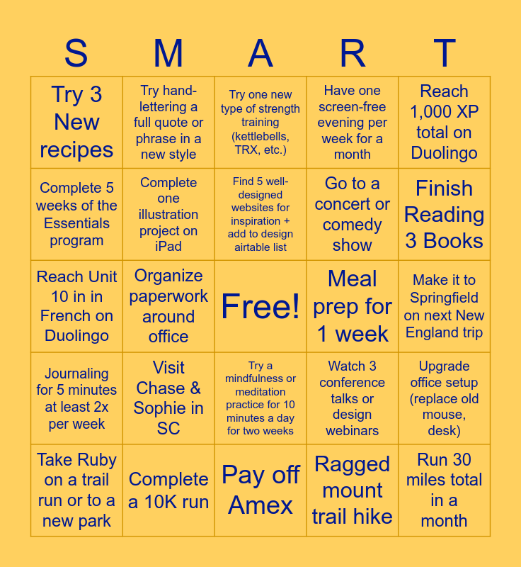 This bingo card has a free space and 24 words: Visit Chase & Sophie in SC, Complete a 10K run, Find 5 well-designed websites for inspiration + add to design airtable list, Take Ruby on a trail run or to a new park, Reach 1,000 XP total on Duolingo, Try 3 New recipes, Complete 5 weeks of the Essentials program, Try hand-lettering a full quote or phrase in a new style, Meal prep for 1 week, Try a mindfulness or meditation practice for 10 minutes a day for two weeks, Go to a concert or comedy show, Reach Unit 10 in in French on Duolingo, Watch 3 conference talks or design webinars, Upgrade office setup (replace old mouse, desk), Complete one illustration project on iPad, Ragged mount trail hike, Make it to Springfield on next New England trip, Try one new type of strength training (kettlebells, TRX, etc.), Finish Reading 3 Books, Organize paperwork around office, Run 30 miles total in a month, Journaling for 5 minutes at least 2x per week, Have one screen-free evening per week for a month and Pay off Amex.