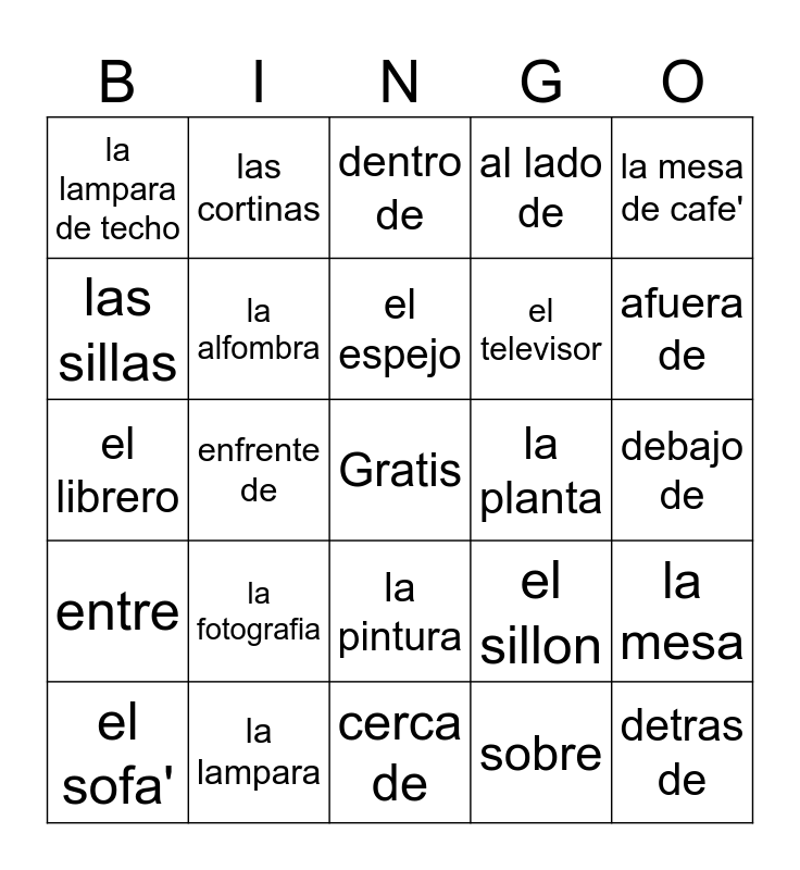 This bingo card has a free space and 24 words: la fotografia, la lampara, el espejo, el sofa', la mesa de cafe', la lampara de techo, las sillas, las cortinas, la planta, la pintura, el televisor, el librero, el sillon, la mesa, la alfombra, sobre, debajo de, dentro de, afuera de, enfrente de, detras de, entre, al lado de and cerca de.