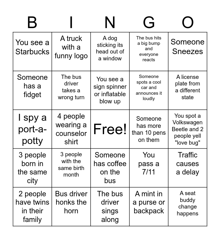 This bingo card has a free space and 24 words: 3 people with the same birth month, Bus driver honks the horn, You see a sign spinner or inflatable blow up, 2 people have twins in their family, Someone Sneezes, You see a Starbucks, Someone has a fidget, A truck with a funny logo, Someone has more than 10 pens on them, Someone has coffee on the bus, Someone spots a cool car and announces it loudly, I spy a port-a-potty, You pass a 7/11, Traffic causes a delay, The bus driver takes a wrong turn, A mint in a purse or backpack, You spot a Volkswagen Beetle and 2 people yell "love bug", A dog sticking its head out of a window, A license plate from a different state, 4 people wearing a counselor shirt, A seat buddy change happens, 3 people born in the same city, The bus hits a big bump and everyone reacts and The bus driver sings along.