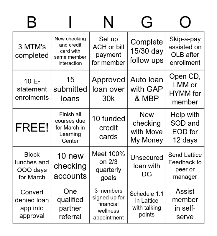 This bingo card has a free space and 24 words: 10 new checking accounts, One qualified partner referral, Approved loan over 30k, Convert denied loan app into approval, Skip-a-pay assisted on OLB after enrollment, 3 MTM's completed, 10 E-statement enrolments, New checking and credit card with same member interaction, New checking with Move My Money, Meet 100% on 2/3 quarterly goals, Auto loan with GAP & MBP, FREE!, Unsecured loan with DG, Send Lattice Feedback to peer or manager, 15 submitted loans, Schedule 1:1 in Lattice with talking points, Help with SOD and EOD for 12 days, Set up ACH or bill payment for member, Open CD, LMM or HYMM for member, Finish all courses due for March in Learning Center, Assist member in self-serve, Block lunches and OOO days for March, Complete 15/30 day follow ups and 3 members signed up for financial wellness appointment.