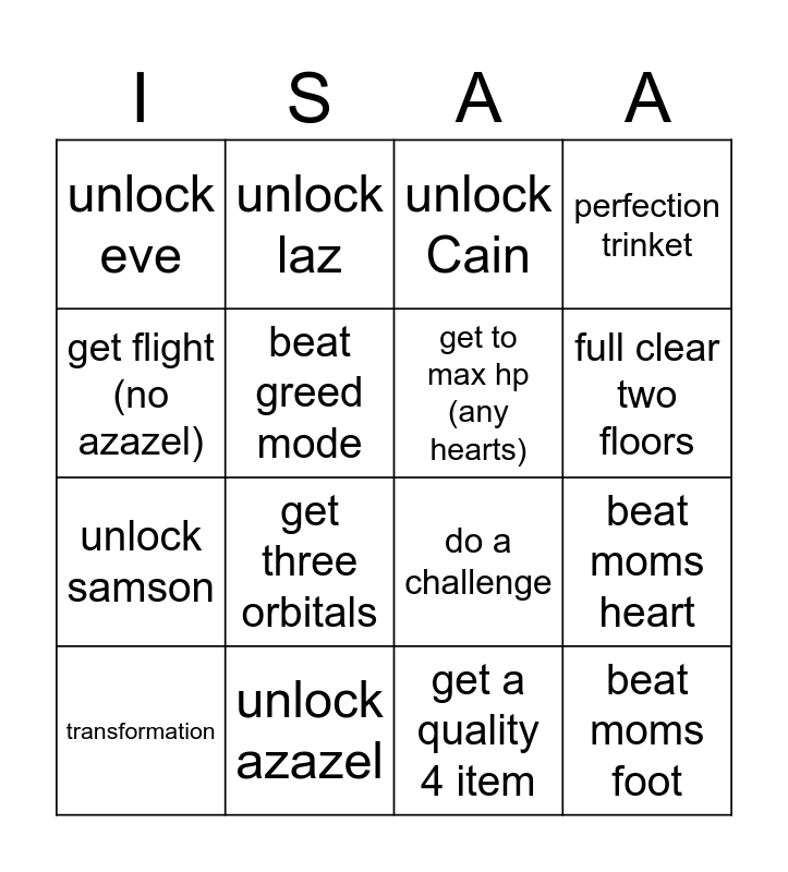 This bingo card has 16 words: unlock azazel, beat moms heart, unlock Cain, unlock eve, unlock samson, unlock laz, do a challenge, get a quality 4 item, get flight (no azazel), beat greed mode, transformation, perfection trinket, get three orbitals, full clear two floors, get to max hp (any hearts) and beat moms foot.