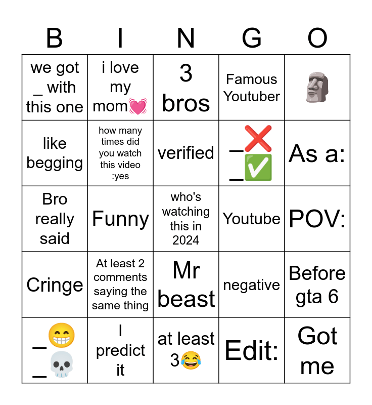 This bingo card has a free space and 24 words: At least 2 comments saying the same thing, I predict it, verified, _😁 _💀, 🗿, we got _ with this one, like begging, i love my mom💓, Youtube, Mr beast, _❌ _✅, Bro really said, negative, Before gta 6, how many times did you watch this video :yes, Edit:, POV:, 3 bros, As a:, Funny, Got me, Cringe, Famous Youtuber and at least 3😂.