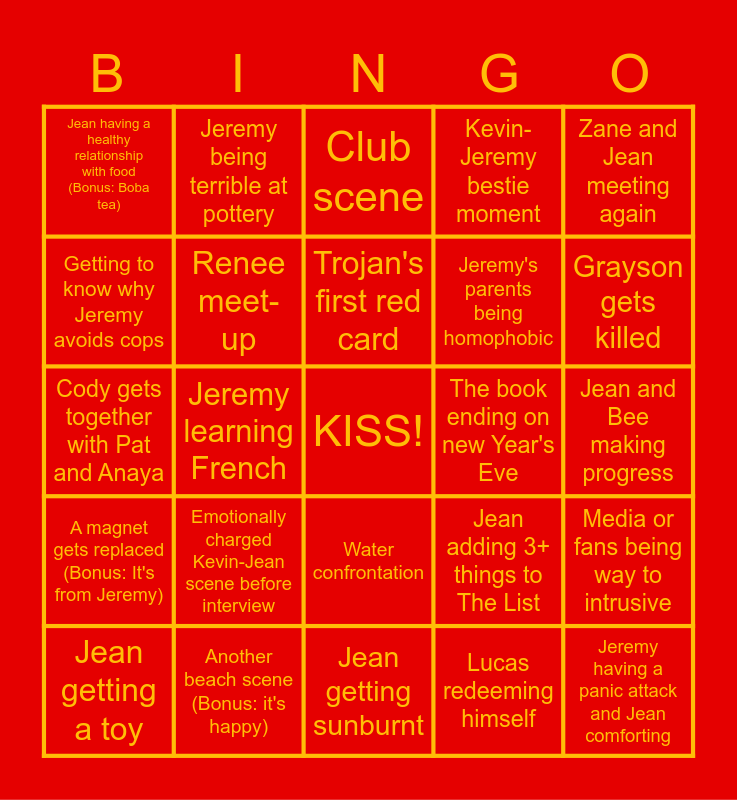 This bingo card has a free space and 24 words: Emotionally charged Kevin-Jean scene before interview, Another beach scene (Bonus: it's happy), Trojan's first red card, Jean getting a toy, Zane and Jean meeting again, Jean having a healthy relationship with food (Bonus: Boba tea), Getting to know why Jeremy avoids cops, Jeremy being terrible at pottery, The book ending on new Year's Eve, Water confrontation, Jeremy's parents being homophobic, Cody gets together with Pat and Anaya, Jean adding 3+ things to The List, Media or fans being way to intrusive, Renee meet-up, Lucas redeeming himself, Jean and Bee making progress, Club scene, Grayson gets killed, Jeremy learning French, Jeremy having a panic attack and Jean comforting, A magnet gets replaced (Bonus: It's from Jeremy), Kevin-Jeremy bestie moment and Jean getting sunburnt.